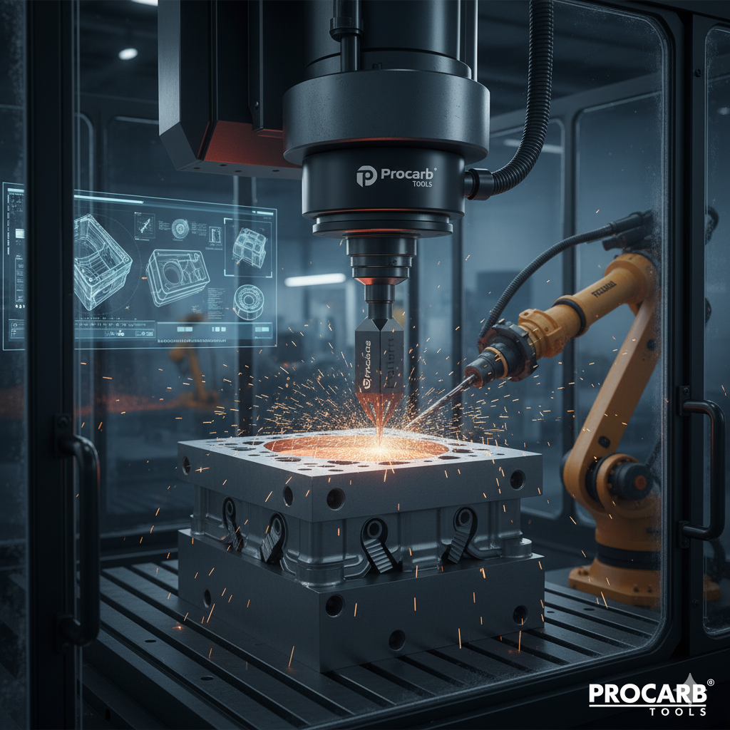 Procarb is a dedicated supplier to the Die & Mould Industry, a foundational sector that drives manufacturing across all industries by creating the precision tooling (molds, dies, and forms) used to mass-produce parts, ranging from plastic casings to automotive engine blocks. This industry demands tools capable of handling the hardest materials with extreme precision to ensure the longevity and flawless quality of the final die or mold, relying primarily on materials like Steel (P), Cast Iron (K), and particularly Hardened Materials (H) used for mold cores and cavities. Procarb’s focus in this sector is on high-accuracy, high-endurance tools: the ProSolid line is the backbone of die and mold work, featuring high-precision tools with advanced coatings like AlTiN and TiAlN for operations such as 3D Contouring, Deep Rib Machining, Engraving, and achieving critical Surface Finishing within complex mold cavities; ProMill is used for the efficient High-Feed Milling and roughing of large steel blocks; and the entire process is secured by ProGrip tool holders, which provide High-Precision Collect Chunks and Runout Control to ensure the micron-level accuracy necessary for the tool’s longevity and the quality of the final injected or stamped part.